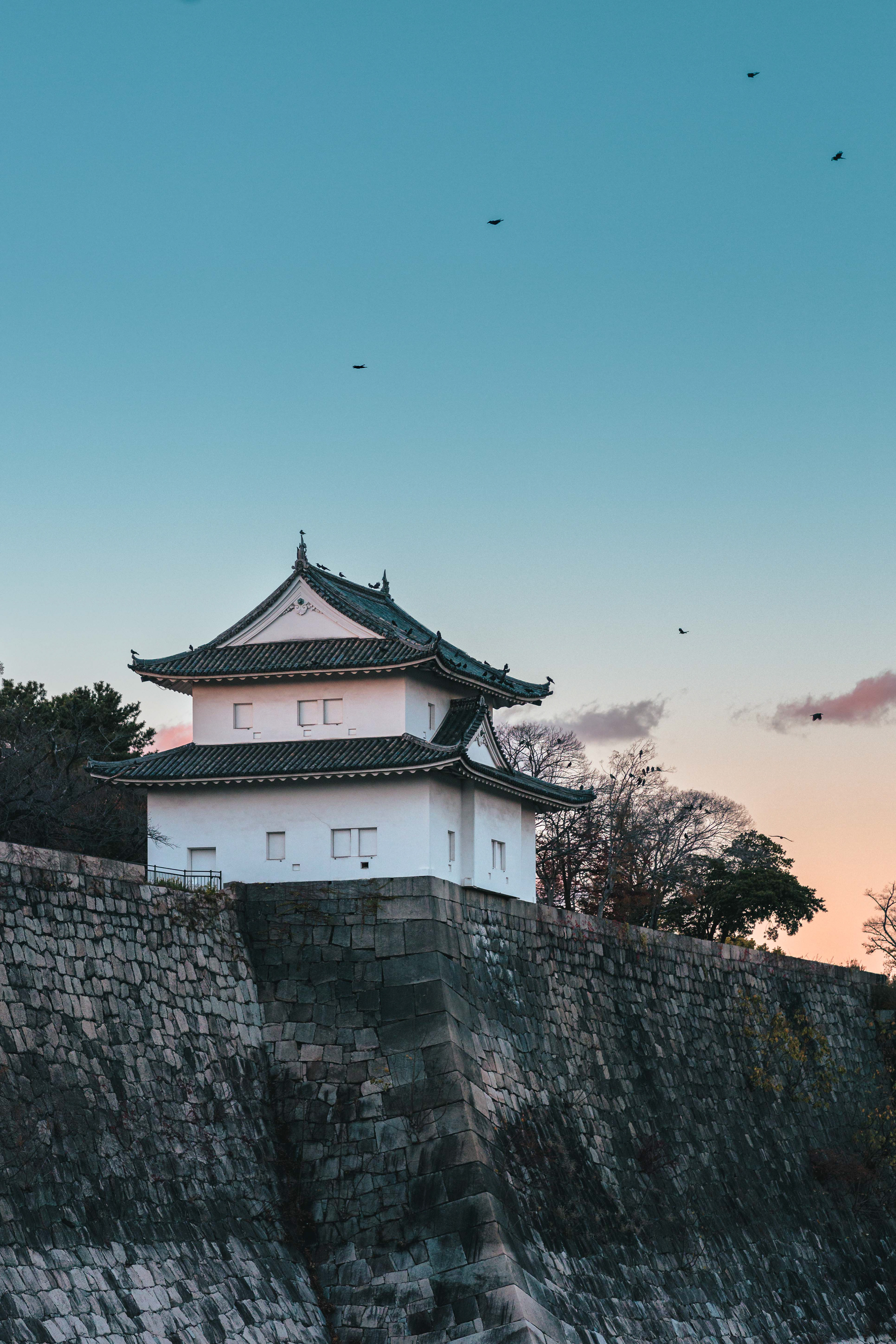 One of the towers of Osaka castle during sunset.