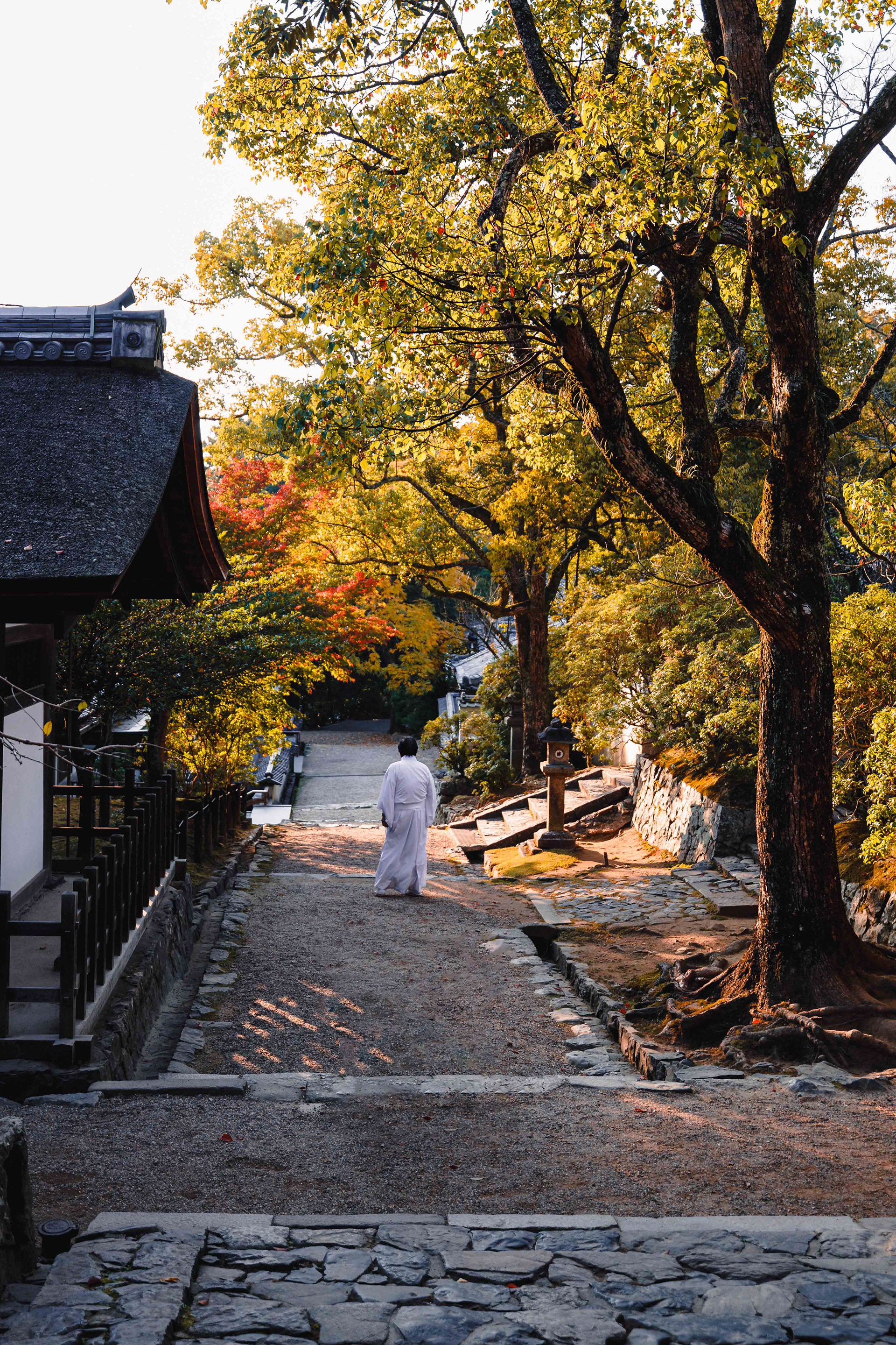 A taxi driving along a road in Nara, surrounded by trees during Koyo in autumn.