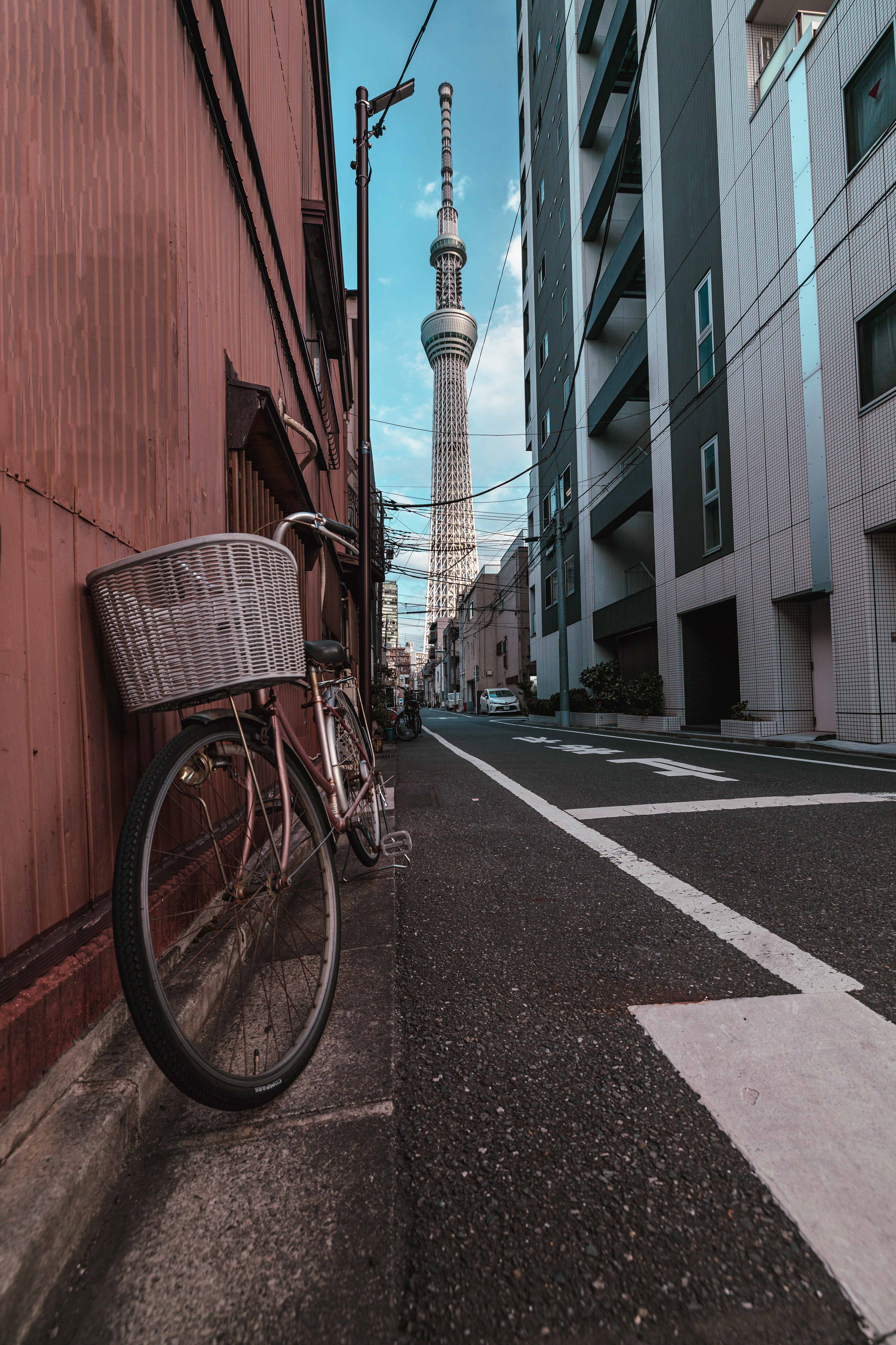 The Skytree in Tokyo with a boat passing under a bridge.